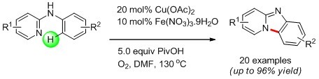 C-H鍵廣泛存在于有機(jī)化合物分子中,并且由于其較高的鍵解離能,對(duì)其選擇性官能化成為合成化學(xué)家們關(guān)注的熱點(diǎn)。這一方法的建立,為快速、高效合成吡啶[1,2-a]苯并咪唑類(lèi)有機(jī)小分子化合物庫(kù)提供了可能。同時(shí),這一創(chuàng)新而有效的Cu/Fe共催化體系,有望將C-H鍵官能化反應(yīng)拓展到其它重要雜環(huán)化合物的合成中。