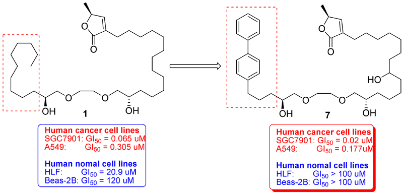 廣州生物院蔣晟研究員、南京大學(xué)姚祝軍教授和北京動(dòng)物所周光飚研究員通過合理藥物設(shè)計(jì),以廉價(jià)易得的乙二醇以及系列炔烴等為起始原料,首次構(gòu)建了系列具有構(gòu)象限制的乙二醇醚簡(jiǎn)化番荔枝內(nèi)酯天然產(chǎn)物,其中具有聯(lián)苯基修飾的化合物7能有效抑制SGC7901腫瘤細(xì)胞的增長(zhǎng)(GI50 = 20 nM),且具有更好的選擇性。
