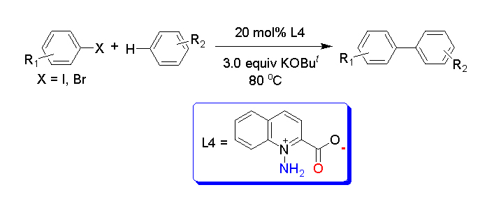 課題組設(shè)計(jì)了一系列新配體,并成功實(shí)現(xiàn)了該配體促進(jìn)的芳基鹵化物(溴化物和碘化物)或雜環(huán)鹵化物與普通芳環(huán)的交叉偶聯(lián)反應(yīng),用以高效地構(gòu)建聯(lián)芳基化合物。這一結(jié)果為合成各種芳烴多環(huán)化合物提供了高效經(jīng)濟(jì)的新方法。實(shí)驗(yàn)證明該反應(yīng)是一種自由基歷程,不同于任何一種經(jīng)典的自由基活化方式。同時(shí)該方法不使用任何過渡金屬(銅,鈀,鎳,鐵,鈷等),解決了合成中的重金屬殘留問題。