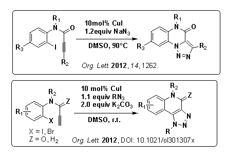 中科院廣州生物醫(yī)藥與健康研究院蔡倩博士與丁克博士研究組利用銅催化的[3+2]環(huán)化/Ullmann類偶聯(lián)串聯(lián)反應(yīng)的方法,通過(guò)分子內(nèi)捕捉[3+2]環(huán)化反應(yīng)中產(chǎn)生的高活性有機(jī)金屬銅中間體,高效的實(shí)現(xiàn)了分子內(nèi)新的芳基C-N鍵或C-C鍵的形成,發(fā)展了合成[1,2,3]三氮唑[1,5-a]喹喔啉-4(5H)-酮及[1,2,3]三氮唑[4,5-c]喹啉-4-酮這兩類化合物的新方法。