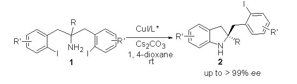 中科院廣州生物院蔡倩博士課題組與南京大學(xué)俞壽云博士課題組合作,采用不對(duì)稱(chēng)去對(duì)稱(chēng)化的方法,首次高光學(xué)選擇性的實(shí)現(xiàn)了銅催化的Ullmann C-N偶聯(lián)反應(yīng)。在CuI/(R)-BINOL衍生的配體作用下,1,3-二(2-碘芳基)丙-2-胺類(lèi)化合物通過(guò)分子內(nèi)的去對(duì)稱(chēng)化C-N偶聯(lián)反應(yīng),可以高收率及高光學(xué)選擇性的得到含叔碳或季碳手性中心的二氫吲哚產(chǎn)物。這一方法也同樣適用于高光學(xué)選擇性的合成1,2,3,4-四氫喹啉化合物。目前該方法相關(guān)成果已經(jīng)被《美國(guó)化學(xué)會(huì)志》接收并在線發(fā)表。