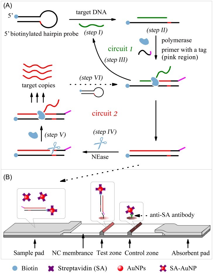 中科院廣州生物醫(yī)藥與健康研究院曾令文研究組基于核酸酶和發(fā)夾DNA探針的等溫信號(hào)擴(kuò)增技術(shù),同時(shí)利用免疫膠體金作為放大顯色系統(tǒng),從而實(shí)現(xiàn)了多重基因分型的目的。當(dāng)有靶標(biāo)核酸存在時(shí),探針識(shí)別靶標(biāo)核酸并與之雜交。該雜交反應(yīng)激活一個(gè)級聯(lián)的、依賴于聚合酶和切刻酶的信號(hào)擴(kuò)增反應(yīng)系統(tǒng),從而達(dá)到信號(hào)放大的目的。