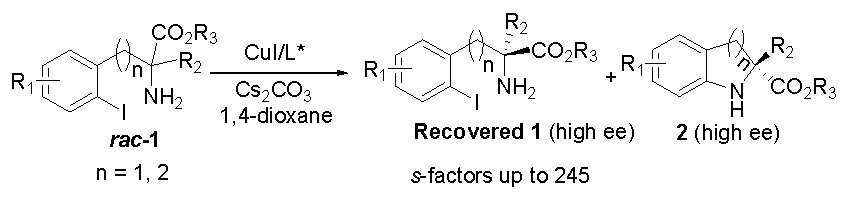 在CuI/(R)-BINOL衍生的配體作用下,消旋的2-氨基-3-(2-碘代芳基)丙酸酯以及2-氨基-4-(2-碘代芳基)-丁酸酯化合物的動力學拆分反應高光學選擇性的生成分子內N-芳基化產物并回收光學富集的原料,反應的選擇因子高達245。這一反應為不對稱N-芳基化反應提供了新的有效方法。