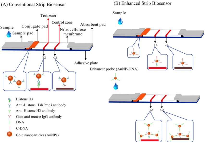 研究人員采用信號(hào)增強(qiáng)的試紙條生物傳感器用于組蛋白甲基化的檢測(cè)。有別于傳統(tǒng)的試紙條,這種新型的試紙條中引入了一個(gè)信號(hào)增強(qiáng)探針(AuNP-DNA),實(shí)現(xiàn)了對(duì)檢測(cè)信號(hào)的進(jìn)一步放大。選擇HeLa細(xì)胞中的組蛋白H3K9三甲基化(me3)作為研究對(duì)象,在0.02ug的HeLa細(xì)胞組蛋白提取液中就能檢測(cè)到,比傳統(tǒng)的試紙條和western blot的靈敏度分別提高了10倍和15倍。該方法簡(jiǎn)便快速,實(shí)驗(yàn)結(jié)果在15分鐘內(nèi)用肉眼就能觀察到,避免了western blot的操作步驟復(fù)雜,操作時(shí)間長(zhǎng)等缺點(diǎn)。這個(gè)方法同樣適用于其他類型的組蛋白甲基化,乙?;揎椀?,具有普遍適用性。