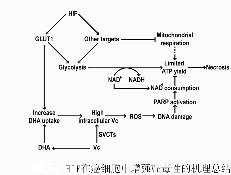 該研究團隊以腎透明型腎癌細(xì)胞(CCRCC)作為腫瘤細(xì)胞研究模型,通過研究維生素C對腎癌細(xì)胞產(chǎn)生細(xì)胞毒性的機理,發(fā)現(xiàn)維生素C可以通過依賴低氧誘導(dǎo)因子(HIF)介導(dǎo)細(xì)胞死亡,且這一現(xiàn)象也被廣泛發(fā)現(xiàn)于其他癌細(xì)胞中。以此為切入點進一步發(fā)現(xiàn),HIF陽性的腎癌細(xì)胞可以通過腫瘤細(xì)胞普遍高表達(dá)的葡萄糖受體GLUT1在胞內(nèi)累積更多的維生素C,并與胞內(nèi)的鐵離子反應(yīng)產(chǎn)生更多的活性氧基團(ROS),進而誘發(fā)嚴(yán)重的DNA損傷。細(xì)胞對DNA損傷的修復(fù)會大量消耗胞質(zhì)內(nèi)的NAD+,由于HIF陽性的腎癌細(xì)胞通過“Warburg 效應(yīng)”依賴低效率的糖酵解途徑獲取能量,其對NAD+驟降的緩沖能力較弱,細(xì)胞因此不可逆的走向了壞死。