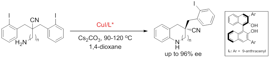 全碳四級手性中心的構(gòu)建,是不對稱合成中最具挑戰(zhàn)性的領(lǐng)域,目前只有極少數(shù)的反應(yīng)能高光學(xué)選擇性地形成全碳四級手性中心。該課題組通過采用不對稱去對稱化策略,發(fā)展了銅催化的芳基C-N偶聯(lián)反應(yīng),成功實現(xiàn)了含氰基的六、七元環(huán)體系全碳四級手性中心的高光學(xué)選擇性構(gòu)建,并通過與北京大學(xué)深圳研究生院吳云東院士和張欣豪老師等人合作,對反應(yīng)的過渡態(tài)進(jìn)行了理論計算,從機(jī)理上對反應(yīng)進(jìn)行了解釋。