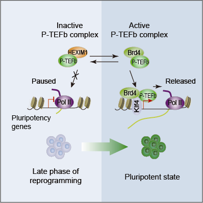 Miguel A. Esteban研究團(tuán)隊(duì)通過分析體細(xì)胞和胚胎干細(xì)胞中的新生RNA轉(zhuǎn)錄本數(shù)據(jù),并通過ChIP-sequencing技術(shù)對重編程過程中不同時間點(diǎn)的RNA 聚合酶 II 的結(jié)合情況進(jìn)行分析,發(fā)現(xiàn)在多能性基因被激活之前,RNA 聚合酶II 已經(jīng)被招募到很多關(guān)鍵多能性基因的啟動子上,但卻是處于一種“暫?!睜顟B(tài)。進(jìn)一步研究發(fā)現(xiàn)轉(zhuǎn)錄延伸因子p-TEFb的活性對于RNA聚合酶II 的暫停-延伸起著關(guān)鍵作用,通過過表達(dá)Brd4或者敲低HEXIM1促進(jìn)p-TEFb的活性,能顯著加速重編程進(jìn)程。最后,該研究發(fā)現(xiàn)重編程因子KLF4能夠和p-TEFb相互作用,并且在基因組水平上共同調(diào)控多能性網(wǎng)絡(luò)的激活和維持。
