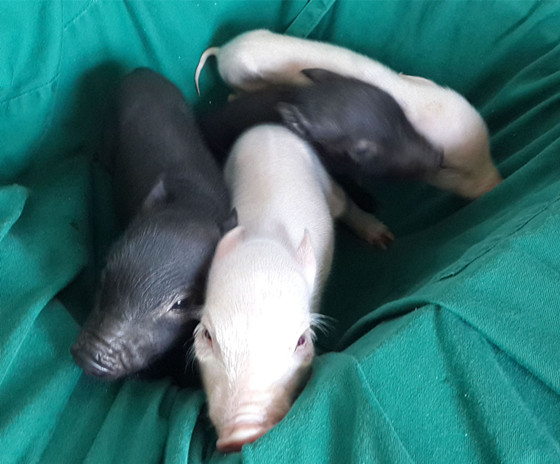 課題組楊化強(qiáng)博士、博士研究生周小青和信吉閣,針對(duì)豬的酪氨酸酶、PARK2和PINK1基因的外顯子設(shè)計(jì)了Cas9 打靶質(zhì)粒,將其分別轉(zhuǎn)染版納小型豬的胎兒成纖維細(xì)胞和巴馬小型豬的胎兒成纖維細(xì)胞后,獲得了純合的酪氨酸酶基因敲除以及PARK2和PINK1雙基因敲除的細(xì)胞系。細(xì)胞系用于體細(xì)胞核移植后獲得15頭酪氨酸酶基因敲除克隆豬,20頭PARK2和PINK1雙基因敲除克隆豬。酪氨酸酶基因敲除后,本為黑色的版納小型豬,變成了白豬,表現(xiàn)出了典型的白化病特征;而缺失PARK2和PINK1雙基因的敲除克隆豬可以作為帕金森癥大動(dòng)物模型,用于研究其發(fā)生機(jī)制和評(píng)估相關(guān)治療藥物的有效性和安全性。