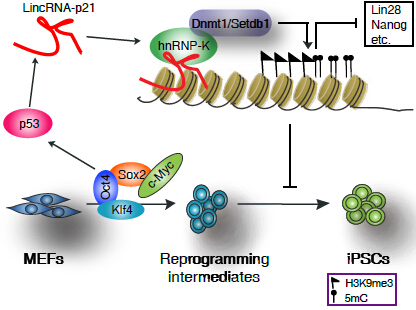 研究人員通過這個方法結(jié)合RNA干擾實(shí)驗(yàn)發(fā)現(xiàn),降低p53誘導(dǎo)產(chǎn)生的一個lncRNA(稱作lincRNA-p21)的表達(dá)能夠明顯促進(jìn)體細(xì)胞重編程的發(fā)生,過表達(dá)則反過來抑制此過程。實(shí)驗(yàn)室進(jìn)一步作用機(jī)理的研究發(fā)現(xiàn),lincRNA-p21影響重編程的產(chǎn)生是不依賴于由p53引起的細(xì)胞調(diào)亡和增殖。它可以跟核內(nèi)不均一蛋白HNRNPK相互作用,并且通過HNRNPK來“招募”抑制性表觀遺傳修飾的蛋白因子SETDB1和DNMT1,形成兩個復(fù)合物分別行使維持相關(guān)多能性基因啟動子區(qū)H3K9me3和CpG甲基化的功能。這一研究證實(shí)了長鏈非編碼RNA可以通過調(diào)控表觀遺傳修飾來阻礙重編程的發(fā)生,進(jìn)一步闡述了體細(xì)胞逆轉(zhuǎn)過程中l(wèi)ncRNA的重要性,同時也豐富了p53對重編程的作用機(jī)理,對以后進(jìn)一步的臨床應(yīng)用具有指導(dǎo)性意義。