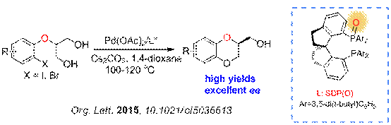 研究團(tuán)隊(duì)通過(guò)采用螺環(huán)雙膦單氧配體(SDP(O)),成功抑制了b-H消除和脫鹵副反應(yīng),以高收率和高光學(xué)選擇性實(shí)現(xiàn)了2-(2-鹵代芳基氧基)-1,3-丙二醇類化合物的去對(duì)稱化偶聯(lián),得到手性苯并二氧六環(huán)結(jié)構(gòu)。該研究通過(guò)計(jì)算化學(xué)的方法,對(duì)反應(yīng)過(guò)渡態(tài)進(jìn)行計(jì)算,從機(jī)理上對(duì)反應(yīng)進(jìn)行了解釋,為光學(xué)選擇性的產(chǎn)生提供了理論支持。