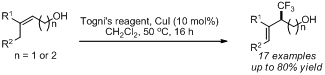 為了解決該問題,該團(tuán)隊(duì)發(fā)現(xiàn)烯丙位羥基的引入對(duì)三取代雙鍵的三氟甲基化反應(yīng)有促進(jìn)作用。該方法能夠方便地合成含非末端的三氟甲基高烯丙醇類化合物或含三氟甲基的氧雜環(huán)丁烷衍生物。該方法的建立為今后設(shè)計(jì)合成含非末端三氟甲基的活性分子奠定了基礎(chǔ),在有機(jī)化學(xué)及藥物化學(xué)研究中具有重要的意義。