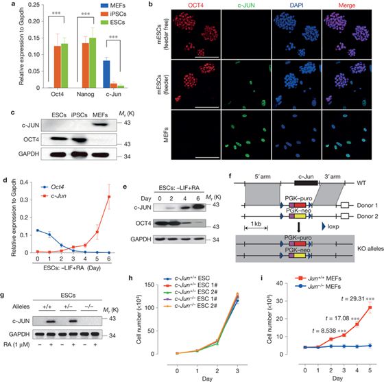 通過這個(gè)思路,實(shí)驗(yàn)組發(fā)現(xiàn)一個(gè)非常著名的癌基因——c-Jun在表達(dá)上非常吻合:它僅在體細(xì)胞中表達(dá),在胚胎干細(xì)胞或iPS細(xì)胞中完全不表達(dá),而在重編程過程中觀察不到明顯的下降。進(jìn)一步的實(shí)驗(yàn)發(fā)現(xiàn),在胚胎干細(xì)胞中敲除c-Jun對(duì)多能性毫無影響,但成纖維細(xì)胞中敲除c-Jun會(huì)造成細(xì)胞完全無法增殖,而在胚胎干細(xì)胞強(qiáng)制表達(dá)c-Jun,胚胎干細(xì)胞會(huì)迅速分化并失去多能性,這些結(jié)果都提示c-Jun與多能性是完全不相容的。在體細(xì)胞重編程中的結(jié)果也完全支持這一結(jié)論,強(qiáng)制表達(dá)c-Jun后,Yamanaka因子介導(dǎo)的體細(xì)胞重編程完全被抑制,而通過多種途徑抑制c-Jun,則能有效地提升iPS細(xì)胞獲得的效率。