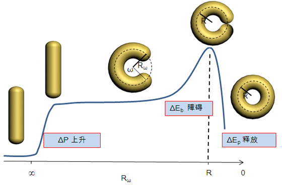 本研究精確測量了線粒體的直徑,并統(tǒng)計(jì)線粒體“甜甜圈”環(huán)結(jié)構(gòu)直徑的數(shù)值分布(95%大于0.8微米)。在此基礎(chǔ)上,本研究構(gòu)建了3D光滑曲面的“幾何線粒體”模型,通過對曲面任意點(diǎn)的積分定量線粒體的3D空間信息,因此這一模型可以模擬線粒體的實(shí)時(shí)動力學(xué):膨脹/縮小,融合/分裂,彎曲和變身為有尾巴和無尾巴的兩種“甜甜圈”。研究組通過計(jì)算線粒體從線狀變身為“甜甜圈”的過程中彎曲能和滲透壓能的變化,構(gòu)建了這一過程自由能變化模型。結(jié)果表明,彎曲能是線粒體變身為“甜甜圈”的主要障礙,而“甜甜圈”直徑小于0.8微米將帶來極大的自由能增加。這一模擬計(jì)算的結(jié)論與實(shí)際觀察的“甜甜圈”環(huán)結(jié)構(gòu)直徑的數(shù)值分布完全一致。