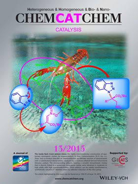 此外,研究人員在此工作的基礎(chǔ)上還發(fā)展了有機(jī)小分子催化的苯并三氮唑與alpha位取代的beta-硝基丙烯酸酯的不對(duì)稱aza-Michael反應(yīng),得到了含有苯并三氮唑結(jié)構(gòu)單元的手性季碳中心,該部分工作以內(nèi)封面論文發(fā)表在《化學(xué)催化》(ChemCatChem, 2015, 7, 1935-1938, Inside backcover)上。