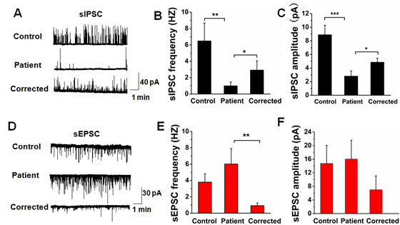 研究人員通過在iPS細(xì)胞水平上敲入紅色熒光蛋白基因來標(biāo)記神經(jīng)元網(wǎng)絡(luò)中的GABA能神經(jīng)元亞型,首次在病人來源的神經(jīng)元網(wǎng)絡(luò)中對表達(dá)Nav1.1的神經(jīng)元亞型做了電生理檢測。同時,對網(wǎng)絡(luò)中自發(fā)抑制性及興奮性突觸后電活動進(jìn)行了分析。研究發(fā)現(xiàn),突變c.a5768G(在外源性轉(zhuǎn)染體系中表現(xiàn)為無Nav1.1流)不僅影響表達(dá)Nav1.1的GABA能神經(jīng)元上Nav總電流幅度的大小,而且影響Nav的通道激活性質(zhì)。該變化進(jìn)一步導(dǎo)致患者來源的神經(jīng)元網(wǎng)絡(luò)中的自發(fā)性抑制性突觸后電流(sIPSCs)減弱。雖然自發(fā)的興奮性突觸后電流(sEPSCs)無顯著性變化,但是,當(dāng)進(jìn)一步分析sIPSCs和sEPSCs的頻率后,研究發(fā)現(xiàn),患者來源的神經(jīng)元網(wǎng)絡(luò)突觸后活動從抑制為主的狀態(tài)轉(zhuǎn)化為興奮性為主的激發(fā)態(tài),這表明,僅僅sIPSCs的變化就足以顯著逆轉(zhuǎn)神經(jīng)元網(wǎng)絡(luò)的興奮性水平?!?/p>