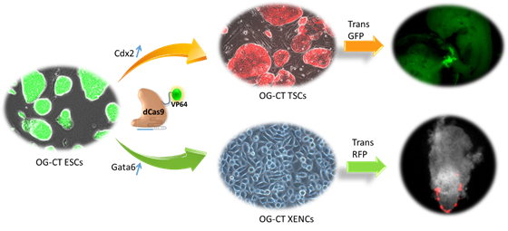 早期胚胎囊胚的組成包括胚胎干細(xì)胞(ESC)、滋養(yǎng)干層細(xì)胞(TSC)和原始內(nèi)胚層細(xì)胞(XEN)。賴良學(xué)課題組研究發(fā)現(xiàn),CRISPR介導(dǎo)的轉(zhuǎn)錄激活因子可有效啟動(dòng)ESC的內(nèi)源基因Cdx2和Gata6基因的表達(dá)。Cdx2是TSC的標(biāo)記基因,Gata6是XEN的標(biāo)記基因,兩者均不在ESC中表達(dá)。通過進(jìn)一步誘導(dǎo)實(shí)驗(yàn)發(fā)現(xiàn),通過調(diào)控這兩個(gè)內(nèi)源性基因的表達(dá),ESC可分別被直接誘導(dǎo)為胚外細(xì)胞TSC和XEN。通過標(biāo)記基因檢測以及體內(nèi)外分化實(shí)驗(yàn)證實(shí)這些誘導(dǎo)細(xì)胞具是有完全功能的細(xì)胞。該研究首次通過直接調(diào)控內(nèi)源基因表達(dá)實(shí)現(xiàn)早期胚胎細(xì)胞之間的細(xì)胞譜系轉(zhuǎn)換。隨著技術(shù)的進(jìn)一步成熟,以后還可用于替代細(xì)胞重編程技術(shù),使細(xì)胞命運(yùn)調(diào)控更加簡單和安全。