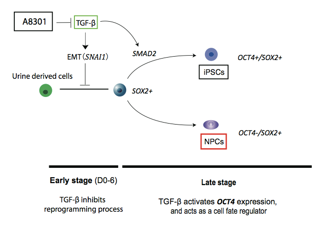 該研究基于潘光錦課題組已有的高效誘導(dǎo)尿液來源細(xì)胞重編程為神經(jīng)前體細(xì)胞的實(shí)驗平臺,研究了該過程中尿液來源細(xì)胞重編程為誘導(dǎo)多能干細(xì)胞(iPSC)或者神經(jīng)前體細(xì)胞(NPC)的命運(yùn)決定機(jī)制。該研究從四種小分子抑制劑中篩選出對于重編程過程最重要的因子A8301(TGF-β通路抑制劑),同時將誘導(dǎo)體系簡化。發(fā)現(xiàn)TGF-β在重編程早期(0-6d)可以誘導(dǎo)EMT相關(guān)基因SNAIL表達(dá),進(jìn)而誘導(dǎo)EMT,阻礙重編程,即抑制TGF-β通路可以提高重編程效率。而在重編程后期(6-18d),TGF-β可以誘導(dǎo)SMAD2表達(dá),進(jìn)而維持OCT4,NANOG基因的活化,促進(jìn)細(xì)胞完全重編程為iPSC,若后期缺乏外源性TGF-β刺激,克隆無法維持內(nèi)源性O(shè)CT4,NANOG基因的持續(xù)激活,因此,在內(nèi)部高水平SOX2基因作用下,克隆將轉(zhuǎn)分化為神經(jīng)前體細(xì)胞。