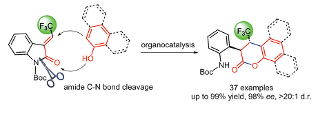 胡文輝組趙軍嶺副研究員帶領的研究小組,使用奎寧衍生的方酰胺為催化劑,以2-吲哚酮衍生的不飽和酰胺和萘酚為反應原料,在僅用2.5mol%的催化劑用量下就可高效的合成光活性的α-芳香基-β-三氟甲基二氫豆香素衍生物。在這個反應過程中2-吲哚酮中的酰胺砌塊作為親電試劑與酚羥基發(fā)生C-N鍵切斷與分子內酯化反應,這個過程一般需要在強酸、強堿或者過渡金屬催化下發(fā)生,本研究代表了一種溫和、高效的酰胺C-N鍵切斷新方法,為以后酰胺砌塊的活化和轉化提供了新思路。