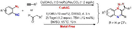 朱強研究組相繼發(fā)展了利用鈀催化的聯(lián)苯異腈合成菲啶衍生物(J. Org. Chem. 2015, 80, 2223-2230), 鈀催化的α異腈乙酰胺的環(huán)化反應合成2-取代噁唑(Chem. Eur. J. 2014, 20, 11220-11224), 鈀催化的亞胺基Heck反應合成環(huán)狀酮亞胺衍生物(Org. Lett. 2016, 18, 3074-3077)。在前面研究的基礎(chǔ)上,研究組最近又發(fā)展了利用官能化的異腈芳基疊氮-異腈,銅催化的串聯(lián)反應合成1,2,3-三氮唑[1,5-a]喹喔啉骨架的新方法,為探究設計新的藥物分子,繼而獲得有價值的先導化合物等提供思路。值得一提的是,該反應制備的1,2,3-三氮唑[1,5-a]喹喔啉衍生物可以在銠的催化作用下進一步轉(zhuǎn)化得到有價值的喹喔啉類化合物(Scheme 1)。該方法在今后合成具有喹喔啉并三氮唑衍生物雜環(huán)藥物方面具有潛在的應用價值。