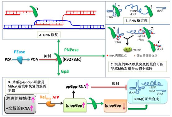 研究團隊發(fā)現(xiàn),過表達突變的Rv2783c基因可以導致Mtb對PZA耐藥;POA可以與Rv2783蛋白結合,但是PZA不與之結合,同時POA也不與Rv2783蛋白結合;首次證實了基因Rv2783c編碼的Rv2783蛋白具有聚核苷酸磷酸化酶(PNPase)功能和鳥苷五磷酸合成酶(GPS I) 活性(如圖所示)。在研究PNPase功能時,研究組開創(chuàng)性地探索新的分析方法并取得成功。其結果顯示,Rv2783蛋白具有不依賴模板而合成ssDNA和RNA的功能,同時具有降解ssDNA和RNA的功能。GPS I功能主要負責水解而非合成(p)ppGpp。POA可以干擾這些功能而PZA本身并不干擾這些功能。這些功能是Mtb存活,特別是在逆境存活的重要生理保障。POA干擾DNA修復,或者干擾各種RNA的穩(wěn)定性,甚至是合成錯誤的RNA進而合成突變的蛋白可能很好解釋“持留(persistence)”現(xiàn)象,即群體中只有小部細菌因為產(chǎn)生了突變的蛋白從而表型耐藥(對藥物耐受),但是它們的基因組并未發(fā)生改變。另外,Rv2783也可能是通過抑制結核菌水解(p)ppGpp從而阻止結核菌從逆境中恢復過來而殺死處于持留狀態(tài)的結核菌。也我們的研究結果顯示該蛋白很可能是PZA的新靶標。