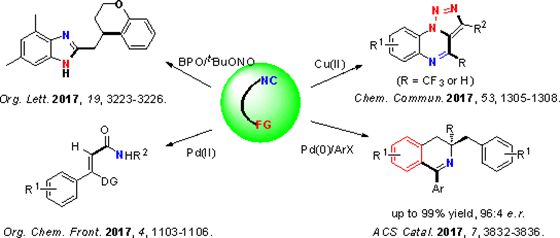 雜環(huán)化合物,尤其是含氮雜環(huán)化合物往往具有重要的生物活性,在藥物研發(fā)中具有重要的地位。發(fā)展高效的含氮雜環(huán)化合物的合成方法一直是有機合成研究的熱點。近年來,隨著過渡金屬催化和自由基化學的快速發(fā)展,異腈越來越廣泛地應用到含氮雜環(huán)化合物的合成中。異腈作為一氧化碳的等電子體,在合成雜環(huán)化合物方面具有重要地位。通過設計官能化異腈來構建雜環(huán)化合物近年來引起了科學家的廣泛關注。