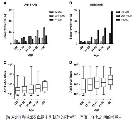 腺病毒是常見(jiàn)的呼吸道病原體,在健康成人中常引起自限性疾病,如普通感冒、流行性角膜結(jié)膜炎、腸胃炎等,而在嬰幼兒、免疫力低下人群以及聚居人群中可導(dǎo)致社區(qū)獲得性肺炎。近年來(lái),新型腺病毒14型(Ad14)和55型(Ad55)在美國(guó)、歐洲以及我國(guó)時(shí)有爆發(fā),具有較強(qiáng)的致病力,可引起重癥肺炎甚至死亡。目前Ad14和Ad55已受到全球公共衛(wèi)生系統(tǒng)的廣泛關(guān)注。但是,Ad14和Ad55在我國(guó)健康人群中的既往流行狀況以及群體免疫水平尚不清楚。