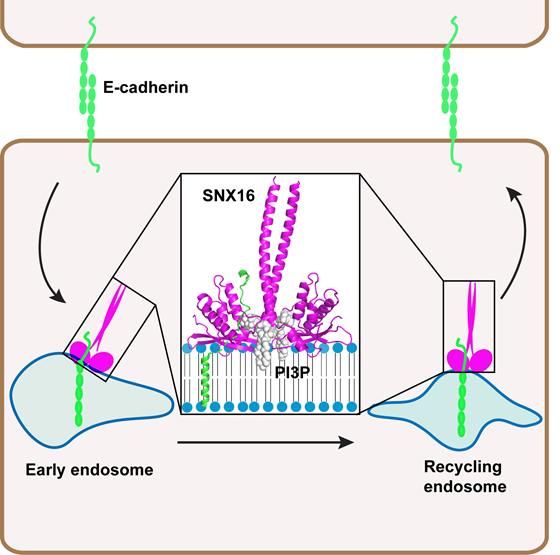 近日,中科院廣州生物醫(yī)藥與健康研究院劉勁松課題組與舒曉東課題組合作,通過結(jié)構(gòu)生物學(xué)和細(xì)胞生物學(xué)研究,揭示了SNX16通過獨(dú)特的內(nèi)體結(jié)合和貨物蛋白識別機(jī)制,調(diào)節(jié)上皮細(xì)胞黏連蛋白E-cadherin的循環(huán)運(yùn)輸。該成果“SNX16 Regulates the Recycling of E-Cadherin through a Unique Mechanism of Coordinated Membrane and Cargo Binding”于2017年7月13日在線發(fā)表于結(jié)構(gòu)生物學(xué)權(quán)威期刊Cell子刊Structure,廣州生物院徐進(jìn)新博士和張蕾蕾博士為該文的共同第一作者。