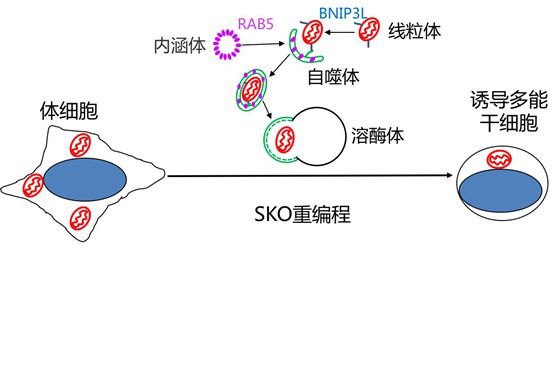 體細(xì)胞重編程技術(shù)不僅極大推動(dòng)了再生醫(yī)學(xué)的發(fā)展,同時(shí)也為細(xì)胞命運(yùn)決定的機(jī)理研究提供了一個(gè)理想的體外模型。劉興國(guó)研究組以Yamanaka三因子“SKO(Sox2, Klf4, Oct4)”誘導(dǎo)的體細(xì)胞重編程模型,發(fā)現(xiàn)線粒體外膜受體BNIP3L在重編程的早期(第5-7天)發(fā)生瞬時(shí)的高表達(dá),這一受體使線粒體被自噬體識(shí)別,吞噬,然后與溶酶體融合降解。這一過(guò)程不要依賴于線粒體電勢(shì)的降低,暨單個(gè)線粒體被降解的命運(yùn)抉擇不依賴其功能良好或喪失,而依賴于外膜受體BNIP3L。進(jìn)一步的研究表明,內(nèi)涵體相關(guān)蛋白R(shí)AB5參與到了SKO重編程中線粒體發(fā)生自噬的膜結(jié)構(gòu)mitophagosome的形成。