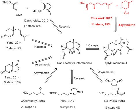 Aplykurodinone-1源于降解的海洋甾體,于2005年在Syphonota geographica海洋軟體動物中分離得到。由于潛在的生物活性及其復(fù)雜的結(jié)構(gòu)特征,它引起了大量合成研究人員的研究興趣。截止目前,共有六個課題組報道了相關(guān)的研究工作。他們的策略各有特色,但都包含了Danishefsky路線中的關(guān)鍵中間體,導(dǎo)致手性控制不好,總產(chǎn)率偏低,合成效率不太理想。