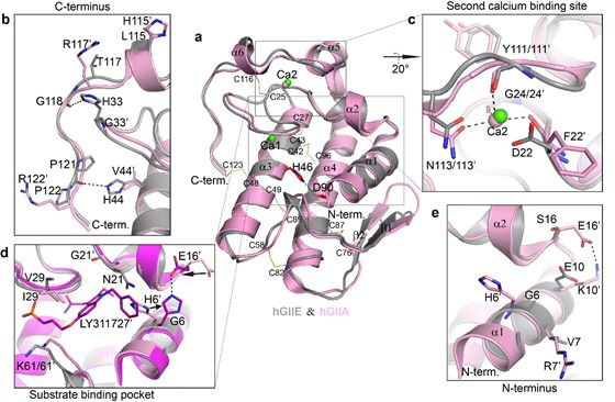 在該研究中,研究人員通過對hGIIE在不同條件下的晶體結(jié)構(gòu)進(jìn)行比較分析,發(fā)現(xiàn)hGIIE的第二個鈣結(jié)合位點(diǎn)比較靈活。研究人員通過進(jìn)一步的突變體酶活性實(shí)驗(yàn)表明,hGIIE的第二個鈣結(jié)合位點(diǎn)以及鄰近的氨基酸Asn21對hGIIE的酶活性的發(fā)揮起著重要作用。