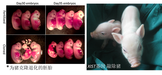 自克隆羊“多莉”的產(chǎn)生,克隆技術(shù)歷經(jīng)幾十年的發(fā)展,但包括豬在內(nèi)的大動物克隆效率仍然十分低下。廣州生物院賴良學(xué)研究組在多年的克隆豬研究中發(fā)現(xiàn),豬克隆胚胎移植到代孕母體后,大部分胎兒都會發(fā)生退化,其機(jī)制目前還不得而知。課題組阮德功博士等研究人員從分析正常發(fā)育的胎兒和退化吸收的胎兒的表達(dá)譜入手,發(fā)現(xiàn)豬的克隆胚胎的基因表達(dá)譜與小鼠明顯不同,小鼠克隆胚胎基因下調(diào)主要出現(xiàn)在X染色體,而豬的克隆胚胎的基因下調(diào)發(fā)生在所有染色體上。研究人員通過基因編輯技術(shù),定點(diǎn)失活XIST基因,可以顯著地拯救下調(diào)的基因,從而提高豬克隆胚胎的體外發(fā)育質(zhì)量和體內(nèi)發(fā)育的潛能,將豬的克隆效率提高約7倍。
