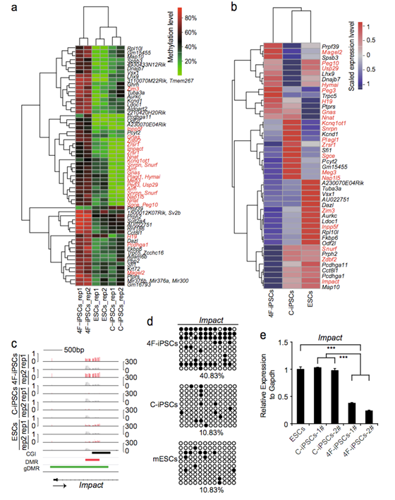 在該研究中,姚紅杰課題組在運用化學(xué)小分子成功將小鼠成纖維細胞誘導(dǎo)為C-iPS細胞的基礎(chǔ)上,與江賜忠課題組合作研究了C-iPS細胞、4F-iPS細胞和mES細胞的DNA甲基化圖譜與基因表達之間的關(guān)系。研究者首先通過簡并亞硫酸鹽測序(RRBS)和轉(zhuǎn)錄組測序分別獲得了培養(yǎng)在相同條件下的C-iPS細胞、4F-iPS細胞和mES細胞的DNA甲基化圖譜和基因達譜數(shù)據(jù)。通過分析發(fā)現(xiàn),雖然C-iPS細胞、4F-iPS細胞和mES細胞在全基因組水平上甲基化程度基本接近,但是前兩者的甲基化程度都略高于mES細胞;而且4F-iPS細胞的DNA甲基化程度要高于C-iPS細胞。研究者發(fā)現(xiàn),與4F-iPS細胞相比,C-iPS細胞的反轉(zhuǎn)錄轉(zhuǎn)座元件的甲基化狀態(tài)更加接近于mES細胞的反轉(zhuǎn)錄轉(zhuǎn)座元件的甲基化狀態(tài)。而且,C-iPS細胞與mES細胞的印記基因有相似的DNA甲基化和基因表達水平,而4F-iPS細胞中的很多印記基因被異常DNA高甲基化而沉默。該研究結(jié)果表明化學(xué)小分子誘導(dǎo)獲得的iPS細胞可能為基礎(chǔ)研究和將來臨床應(yīng)用都提供了一個較好的策略,而轉(zhuǎn)錄因子誘導(dǎo)獲得的iPS細胞所導(dǎo)致印記基因異常DNA甲基化可能是將來臨床應(yīng)用的一個限制因素。