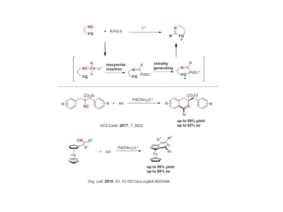 由于異腈與金屬中心的強配位能力,異腈基團(tuán)的存在直接影響了手性配體和金屬中心的配位,從而降低了金屬中心和配體對底物的手性控制。因此,基于異腈插入的不對稱催化反應(yīng)目前還很少報道,是一個非常具有挑戰(zhàn)性的難題。在這之前的相關(guān)報道中,對映選擇性(ee值)最高只有70%左右,而且也只適用于結(jié)構(gòu)特殊的異腈。最近,朱強課題組在鈀催化的不對稱異腈插入領(lǐng)域取得重要突破。他們設(shè)計了官能化異腈的策略,讓反應(yīng)先發(fā)生異腈遷移插入,再通過手性配體調(diào)控產(chǎn)生手性,這樣有效降低了異腈與手性配體之間的競爭,在對映選擇性上實現(xiàn)了質(zhì)的飛躍。他們和中科院上海有機化學(xué)研究所的游書力研究員合作,利用官能化異腈的策略,通過鈀催化的亞胺化/不對稱碳?xì)滏I活化,合成了含手性季碳的3,4-二氫異喹啉衍生物。該反應(yīng)具有很高的收率(最高達(dá)99%)和ee值(最高達(dá)92%)(ACS Catalysis, 2017, 7, 3832.);隨后,他們又利用類似的策略,合成了含有平面手性的吡啶并-[3,4,b]-二茂鐵結(jié)構(gòu),反應(yīng)的產(chǎn)率最高達(dá)到99%,并且ee值進(jìn)一步提升,最高達(dá)99% (Org. Lett. 2018, DOI: 10.1021/acs.orglett.8b00348.)。