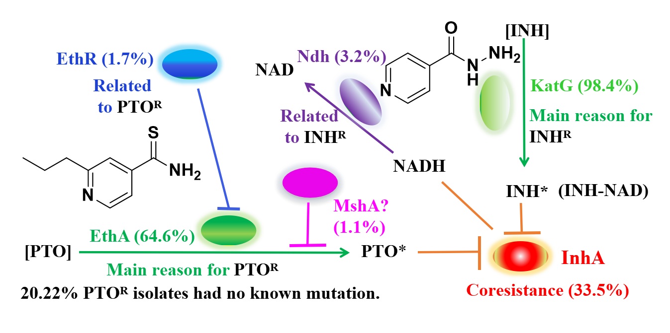 耐藥結(jié)核病分為單耐藥(主要是對利福平或異煙肼,Isoniazid,INH,俗稱雷米封)、多耐藥(對一種以上一線抗結(jié)核藥物耐藥,不包括同時對異煙肼和利福平耐藥)、耐多藥(MDR,至少對利福平和異煙肼耐藥),廣泛耐藥(XDR, MDR加上至少對一種注射藥物且對一種喹諾酮類藥物耐藥),甚至是完全耐藥(TDR,對所有測試的藥物都耐藥)??梢?,異煙肼耐藥在耐藥結(jié)核菌上的嚴(yán)重性。丙硫異煙胺(Prothionamide,PTO)是臨床上用于治療耐藥結(jié)核的二線殺菌藥物,具有效果好,毒副作用低等特點(diǎn)。?