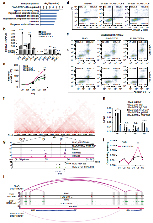 運(yùn)用一系列生物化學(xué)和分子生物學(xué)的研究方法,該研究團(tuán)隊(duì)揭示CTCF存在跳躍外顯子3和4的可變剪接體CTCF-s(蛋白序列缺失CTCF的N末端和2.5個(gè)鋅指結(jié)構(gòu))。運(yùn)用帶有生物素標(biāo)簽的CTCF和CTCF-s來特異性區(qū)分CTCF長(zhǎng)和短可變剪接體在基因組DNA結(jié)合基序的異同,發(fā)現(xiàn)CTCF長(zhǎng)和短可變剪接體在基因組上的結(jié)合基序雖有很大的相似性,但由于CTCF-s蛋白質(zhì)缺少鋅指結(jié)構(gòu)3(ZF3)(由24個(gè)氨基酸組成)的前7個(gè)氨基酸(HKCPDCD),因此不再擁有ZF3結(jié)合的核心基序(C/G和T/C)。與經(jīng)典CTCF的DNA結(jié)合基序相比,CTCF-s的DNA結(jié)合基序有2個(gè)堿基的缺失,正好對(duì)應(yīng)CTCF-s中缺失的鋅指結(jié)構(gòu)。通過使用特異性識(shí)別經(jīng)典CTCF的N末端的抗體富集CTCF結(jié)合的DNA,發(fā)現(xiàn)CTCF-s能夠競(jìng)爭(zhēng)性結(jié)合經(jīng)典CTCF在基因組的部分結(jié)合位點(diǎn),導(dǎo)致CTCF/Cohesin在這些結(jié)合位點(diǎn)上富集水平明顯下降。從染色質(zhì)高級(jí)結(jié)構(gòu)的調(diào)控方面,該研究團(tuán)隊(duì)發(fā)現(xiàn)過表達(dá)CTCF-s導(dǎo)致經(jīng)典CTCF在全基因組范圍介導(dǎo)的遠(yuǎn)距離染色質(zhì)相互作用能力顯著降低。另外該研究揭示CTCF-s可以促進(jìn)干擾素信號(hào)通路相關(guān)基因的表達(dá);進(jìn)一步發(fā)現(xiàn)CTCF-s通過破壞經(jīng)典CTCF在干擾素α誘導(dǎo)蛋白6(IFI6)基因區(qū)域的三維空間構(gòu)象而促進(jìn)IFI6基因遠(yuǎn)端增強(qiáng)子和啟動(dòng)子之間的相互作用而激活IFI6基因的表達(dá),從而導(dǎo)致細(xì)胞凋亡。