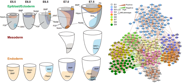 圖3. 胚層關鍵信號作用區(qū)域及關鍵轉(zhuǎn)錄因子調(diào)控網(wǎng)絡