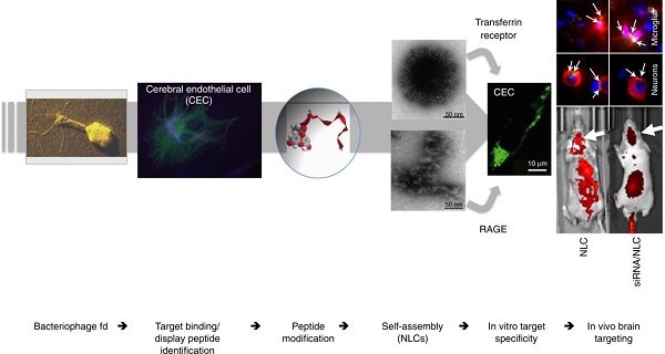 研究發(fā)現(xiàn)該層次結(jié)構(gòu)的納米配體載體通過(guò)轉(zhuǎn)鐵蛋白受體(transferrin receptor)和晚期糖基化終產(chǎn)物受體(the receptor for advanced glycation-end products)靶向腦內(nèi)皮細(xì)胞,并可以高效穿過(guò)小鼠血腦屏障到達(dá)神經(jīng)元和小膠質(zhì)細(xì)胞。更為重要的是納米配體載體可以裝載靶向β-分泌酶1(BACE1)的siRNA分子(BACE1酶是產(chǎn)生β-淀粉樣蛋白關(guān)鍵酶,而β-淀粉樣蛋白在大腦中的過(guò)度累積是阿爾茲海默癥典型的病理特征,所以BACE1酶是阿爾茲海默癥治療藥物的熱門(mén)靶點(diǎn))通過(guò)靜脈注射進(jìn)入小鼠大腦中,并有效地抑制BACE1的表達(dá)。整個(gè)系統(tǒng)沒(méi)有毒性和炎癥反應(yīng)。因此,該研究開(kāi)發(fā)的納米配體載體作為一種安全的多功能納米載體,避免了噬菌體展示肽表面修飾納米顆粒主動(dòng)靶向有效性和特異性弱的缺點(diǎn),通過(guò)化學(xué)修飾賦予多肽配體自組裝形成可靶向的納米載體來(lái)實(shí)現(xiàn)主動(dòng)靶向性。為中樞神經(jīng)疾病藥物的腦靶向傳遞臨床轉(zhuǎn)化研究提供新的技術(shù)和理論基礎(chǔ)。