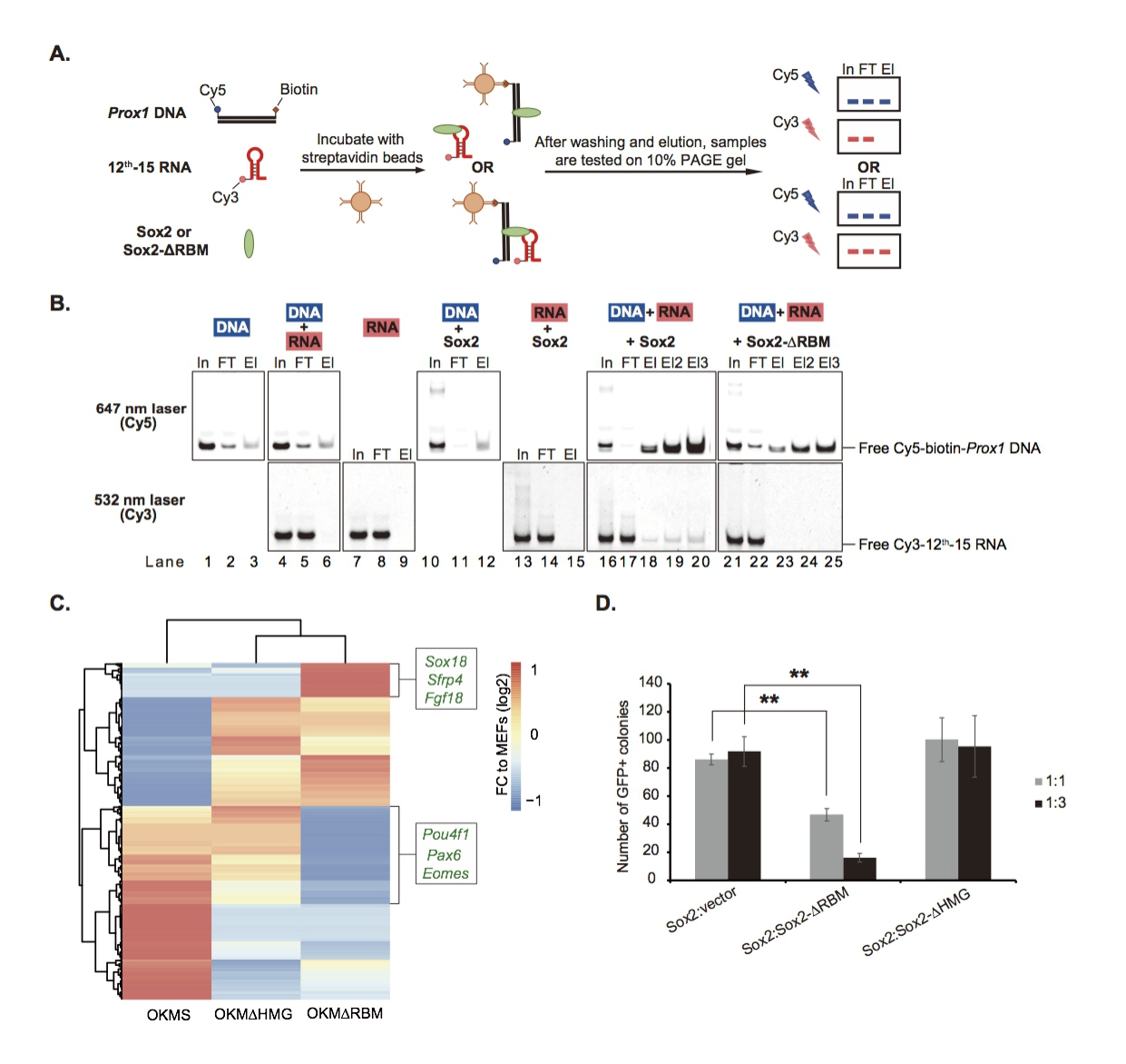 真核生物中,大約8%左右的核酸結(jié)合蛋白具有同時結(jié)合DNA和RNA的屬性(DNA- and RNA- binding proteins, 簡稱DRBPs)。這些DRBP廣泛參與mRNA加工、轉(zhuǎn)錄調(diào)控、DNA復(fù)制、DNA修復(fù)、應(yīng)激反應(yīng)和凋亡等生物學(xué)事件。Sox轉(zhuǎn)錄因子是胚胎發(fā)育和細(xì)胞重編程過程中確定細(xì)胞命運(yùn)的重要調(diào)控因子,它在多能干細(xì)胞和神經(jīng)干細(xì)胞的更新和分化等過程中發(fā)揮了重要作用。此前一些證據(jù)表明,Sox2、hnRNP家族成員和長非編碼RNA(RMST)相互作用,調(diào)控神經(jīng)細(xì)胞分化,然而,Sox2是否直接與RNA結(jié)合? Sox2的哪些結(jié)構(gòu)域負(fù)責(zé)與RNA直接相互作用?在細(xì)胞重編程的過程中,DNA與RNA的結(jié)合功能如何相互協(xié)作? 都是需要深入研究的科學(xué)問題。
