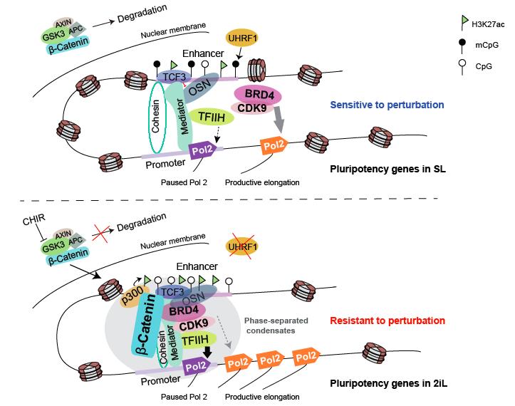 近日,中國(guó)科學(xué)院廣州生物醫(yī)藥與健康研究院Miguel A. Esteban實(shí)驗(yàn)室和以色列魏茨曼科學(xué)研究院Jacob H. Hanna實(shí)驗(yàn)室及武漢大學(xué)陳亮實(shí)驗(yàn)室的研究人員合作在Science Advances在線發(fā)表了文章‘β-Catenin safeguards the ground state of mouse pluripotency by strengthening the robustness of the transcriptional apparatus’。該研究發(fā)現(xiàn)在基態(tài)多能干細(xì)胞中,激活的β-catenin通過在多能性位點(diǎn)招募輔調(diào)控因子促進(jìn)多能性基因的轉(zhuǎn)錄起始,減少了對(duì)BRD4/CDK9調(diào)控的暫停釋放的依賴,但是對(duì)抑制轉(zhuǎn)錄起始更敏感,從而解釋了基態(tài)多能干細(xì)胞在面臨外界擾動(dòng)時(shí)更穩(wěn)定的原因。但與此同時(shí),胚胎多能干細(xì)胞的細(xì)胞周期相關(guān)的基因仍然高度依賴暫停釋放機(jī)制進(jìn)行轉(zhuǎn)錄,因此兩種條件下的胚胎多能干細(xì)胞的增殖均對(duì)抑制BRD4/CDK9敏感。
