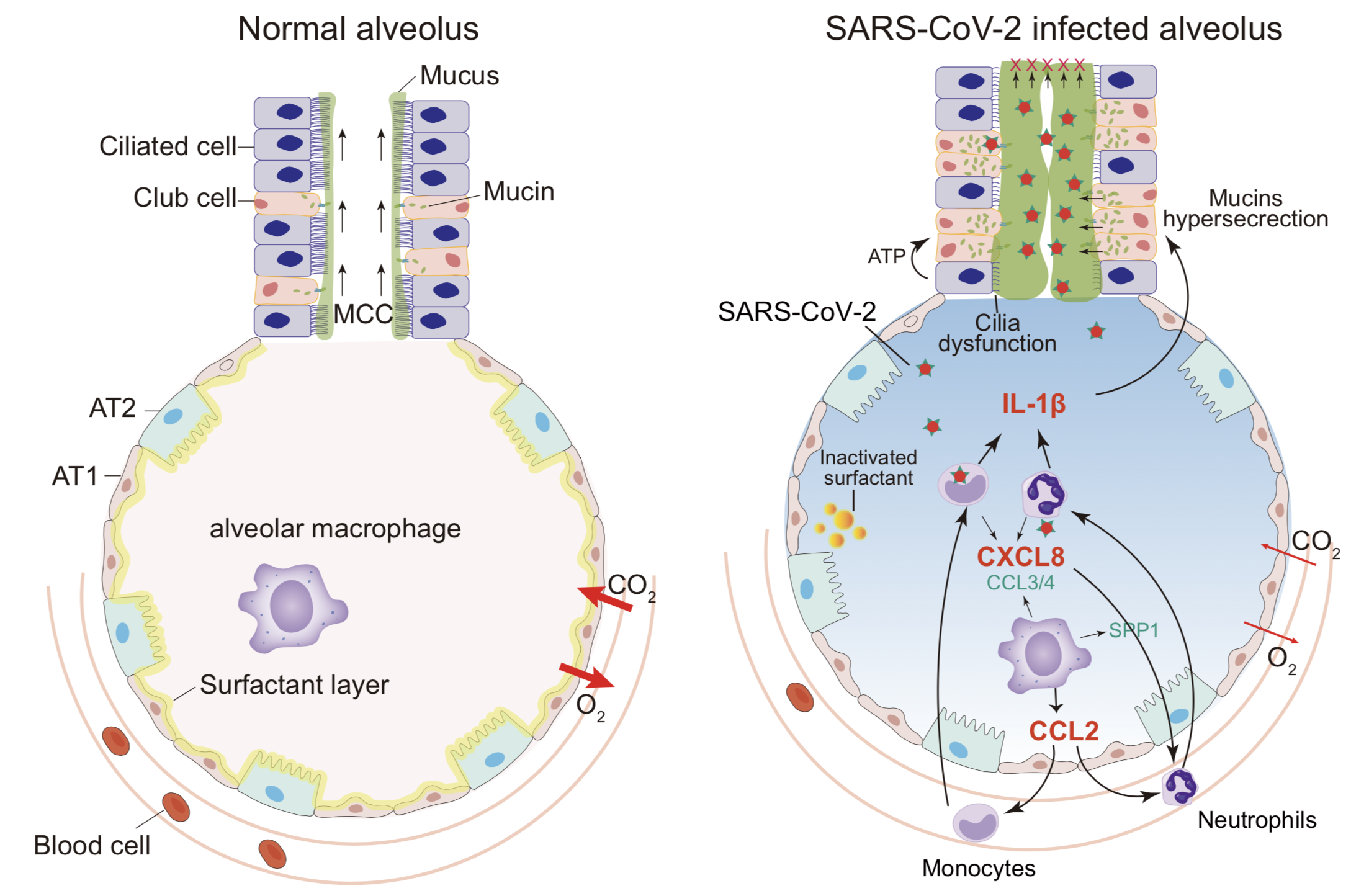 肺是新冠病毒感染的主要器官,目前大部分新冠病人的直接死因源于呼吸衰竭導(dǎo)致的急性呼吸窘迫癥(ARDS)。ARDS是新冠危重癥患者的主要病癥,同時(shí)病程極長(zhǎng),導(dǎo)致重癥監(jiān)護(hù)室(ICU)資源急劇耗盡,因此,新冠危重癥的ARDS病理機(jī)制研究對(duì)于有效應(yīng)對(duì)疫情具有重要意義。臨床檢測(cè)及尸檢結(jié)果表,重癥新冠病人病毒感染后會(huì)刺激肺產(chǎn)生大量凝膠狀流動(dòng)性極差的粘液,這些粘液會(huì)堵塞支氣管甚至肺泡,使正常呼吸氣體交換受阻,是造成重癥患者ARDS的重要原因之一。目前,新冠病人粘液從何而來并不清楚,因此,了解新冠病人粘液產(chǎn)生的來源及原因?qū)εR床治療具有重要指導(dǎo)意義。