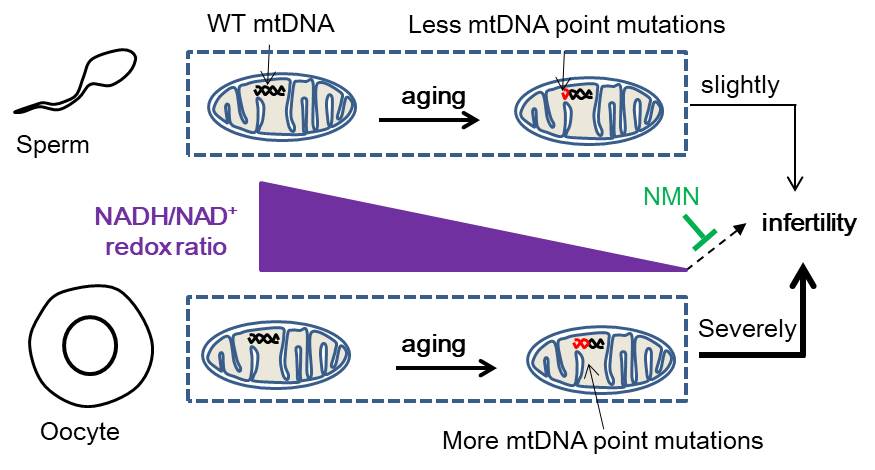 老齡生育不但是生殖與再生醫(yī)學(xué)領(lǐng)域的基本科學(xué)問題,而且是當(dāng)今我國(guó)國(guó)情的重大國(guó)家需求。衰老是影響男性和女性生育能力的關(guān)鍵因素之一,其中女性生育力通常在30歲后下降。另一方面,快速的環(huán)境變化也可能導(dǎo)致近年來(lái)不育率急劇上升。線粒體作為細(xì)胞內(nèi)含有DNA的能量工廠,其功能障礙被假設(shè)在年齡和環(huán)境導(dǎo)致的不育中起重要作用。然而,衰老積累的線粒體DNA突變是否以及如何調(diào)節(jié)生育力及其性別依賴性仍然未知。
