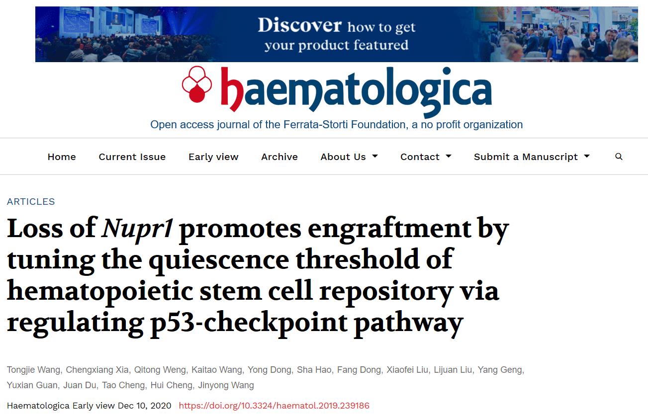 12月10日,中科院廣州生物醫(yī)藥與健康研究院王金勇課題組和中國(guó)醫(yī)學(xué)科學(xué)院血液學(xué)研究所實(shí)驗(yàn)血液學(xué)國(guó)家重點(diǎn)實(shí)驗(yàn)室程輝/程濤課題組合作攻關(guān),在造血干細(xì)胞穩(wěn)態(tài)調(diào)控領(lǐng)域研究取得新突破,最近在Haematologica(血液學(xué)雜志)在線發(fā)表了題為L(zhǎng)oss of Nupr1 promotes engraftment by tuning the quiescence threshold of hematopoietic stem cell repository via regulating p53-checkpoint pathway的論文。該研究發(fā)現(xiàn):轉(zhuǎn)錄因子Nupr1通過(guò)p53信號(hào)通路調(diào)控造血干細(xì)胞(HSC)休眠態(tài)和激活態(tài)的轉(zhuǎn)換,敲除Nupr1的HSC更多的處于增殖期并具備更強(qiáng)的移植競(jìng)爭(zhēng)優(yōu)勢(shì),這一發(fā)現(xiàn)揭示了HSC穩(wěn)態(tài)調(diào)控的新機(jī)制。