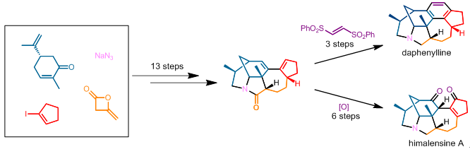 邱發(fā)洋課題組以(S)-Carvone作為手性源,以13步反應(yīng)合成了一個(gè)通用手性中間體,而該中間體是虎皮楠家族中許多成員的共同結(jié)構(gòu)特征。在此基礎(chǔ)上,可以通過組合化學(xué)模式合成多種結(jié)構(gòu)特征的虎皮楠生物堿。作為示范,邱發(fā)洋課題組從該中間體出發(fā),分別以3步和6步反應(yīng)實(shí)現(xiàn)了(-)-Daphenylline和(-)-Himalensine A的不對(duì)稱全合成。該全合成路線是(-)-Daphenylline分子的全合成中反應(yīng)步驟最少、產(chǎn)率最高的路線。