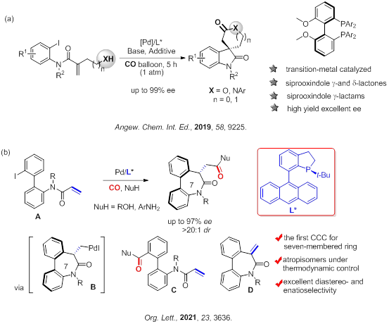 然而,過渡金屬催化的不對稱羰基化反應是羰基化領域的一個難點。這是因為一氧化碳可以作為配體與金屬中心發(fā)生配位,從而影響手性配體的調控。因此,過渡金屬催化的不對稱羰基化反應是有機合成領域中一項非常具有挑戰(zhàn)性的課題。之前成功的例子主要集中在過渡金屬(Pt, Rh, Pd)催化的烯烴的氫羰基化類型的反應上,這類反應通常需要較高壓力的CO和H2,反應條件比較苛刻,產物的結構也比較單一。