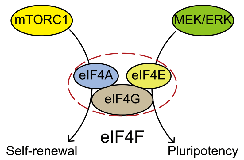 近日,中國科學(xué)院廣州生物醫(yī)藥與健康研究院秦寶明實驗室揭示mTOR調(diào)控胚胎干細胞自我更新的新機制,相關(guān)成果以The mTORC1-eIF4F axis controls paused pluripotency為題于12月6日發(fā)表在EMBO Reports期刊。該工作中,研究人員發(fā)現(xiàn)mTOR調(diào)控mESC自我更新主要來自mTORC1的作用,具體機制與全基因組轉(zhuǎn)錄無關(guān),而主要通過翻譯起始復(fù)合物eIF4F(eukaryotic translation initiation factor 4F)協(xié)同調(diào)控細胞質(zhì)和線粒體的蛋白翻譯來實現(xiàn)。因此,內(nèi)源mTORC1在mESC中維持自我更新而不參與維持多能性。此外,該研究還發(fā)現(xiàn)在經(jīng)典的血清培養(yǎng)條件下,eIF4F還調(diào)控多能性蛋白的翻譯,這一作用依賴于MEK/ERK通路,而與mTORC1無關(guān)。