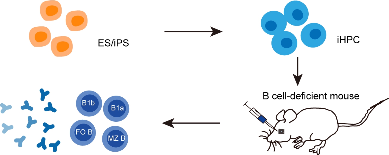 B細(xì)胞是體液免疫的關(guān)鍵細(xì)胞成分,包括固有免疫B1細(xì)胞和獲得性免疫B2細(xì)胞(MZ B, FO B)兩大類群。任何一種B細(xì)胞缺陷都會(huì)導(dǎo)致體液免疫受損,甚至導(dǎo)致嚴(yán)重感染類疾病。對(duì)于B細(xì)胞功能低下和不全相關(guān)疾病的治療,再生B細(xì)胞是一個(gè)理想的選擇。骨髓和脾臟等B細(xì)胞的發(fā)育場所有著極為復(fù)雜的微環(huán)境,多年來研究者們嘗試多種體外再生B細(xì)胞的方法,但都因?yàn)闊o法模擬上述復(fù)雜的B細(xì)胞發(fā)育微環(huán)境而停滯不前。王金勇課題組在多潛能干細(xì)胞(PSC)中共表達(dá)Runx1, Hoxa9, Lhx2三個(gè)轉(zhuǎn)錄因子,通過在造血發(fā)生(Hemogenesis)以及B淋系生成(lymphogenesis)階段連續(xù)作用產(chǎn)生造血種子,移植后巧妙利用B細(xì)胞先天缺失小鼠的體內(nèi)微環(huán)境,成功在小鼠體內(nèi)誘導(dǎo)出完整而成熟的B細(xì)胞譜系。