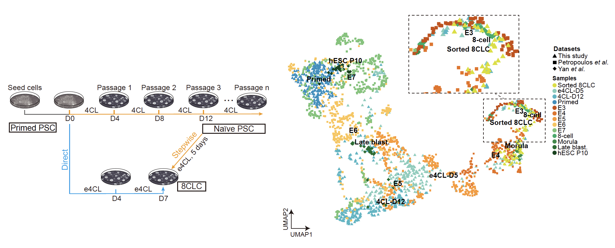 3月22日,中國科學(xué)院廣州生物醫(yī)藥與健康研究院Miguel A. Esteban研究組開發(fā)了一種非轉(zhuǎn)基因、快速且可控的重編程方法,將人多能干細胞(PSC)誘導(dǎo)為全能性的8細胞期胚胎樣細胞(8CLC),相關(guān)進展以Rolling back of human pluripotent stem cells to an 8-cell embryo-like stage”題發(fā)表在Nature雜志上。研究人員運用單細胞測序技術(shù),分析確定了8CLC與人8細胞期胚胎的高度相似性,描繪了轉(zhuǎn)化過程的關(guān)鍵分子事件和基因調(diào)控網(wǎng)絡(luò),并進一步評估了8CLC的分化能力。