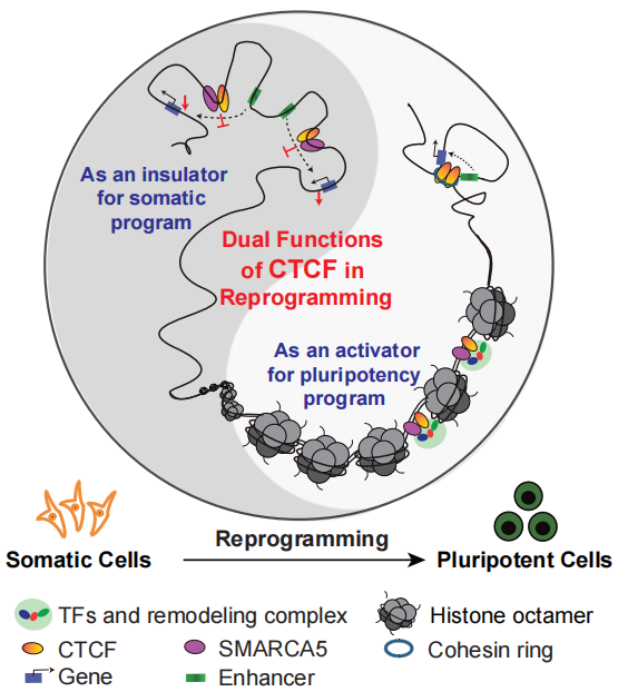 研究人員發(fā)現(xiàn)CTCF在體細(xì)胞重編程過程中表達(dá)逐漸升高,并發(fā)揮促進(jìn)體細(xì)胞重編程為誘導(dǎo)多能干細(xì)胞的作用。在此過程中,CTCF具有同時抑制體細(xì)胞相關(guān)基因表達(dá)和促進(jìn)多能性基因網(wǎng)絡(luò)激活的雙重功能。機(jī)制分析發(fā)現(xiàn)CTCF不僅通過發(fā)揮染色質(zhì)絕緣功能抑制體細(xì)胞相關(guān)基因的表達(dá),而且發(fā)現(xiàn)CTCF具有維持多能性基因染色質(zhì)開放的作用,CTCF還結(jié)合在部分多能性基因啟動子區(qū),促進(jìn)這些多能性基因增強(qiáng)子(Enhancer)和啟動子(Promoter)之間的相互作用(EP互作)。此外,該研究還揭示CTCF與染色質(zhì)重塑因子SMARCA5形成蛋白復(fù)合物,有助于維持多能性基因的染色質(zhì)開放和多能性轉(zhuǎn)錄因子的結(jié)合,促進(jìn)多能性基因網(wǎng)絡(luò)的激活。
