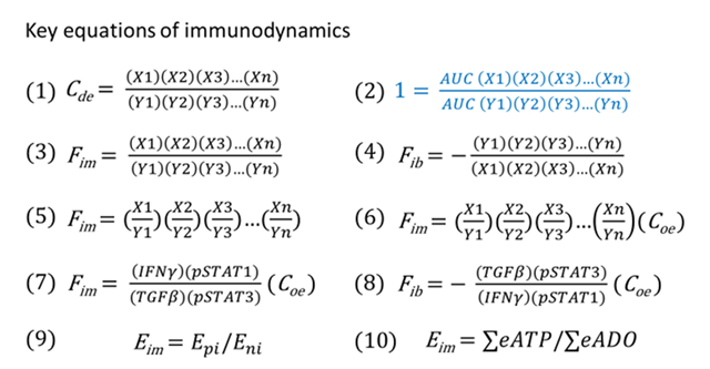 現(xiàn)代免疫學(xué)在多個學(xué)科不斷發(fā)展的支撐下正在蓬勃發(fā)展,涉及眾多理論和先進(jìn)技術(shù),如基因組學(xué)、轉(zhuǎn)錄組學(xué)、免疫組學(xué)、代謝組學(xué)和免疫代謝組學(xué)等,但其核心理論是免疫識別理論,涉及“自我”和“非我”的識別機制,天然免疫的模式識別機制和適應(yīng)性免疫的T細(xì)胞和B細(xì)胞受體庫的生成和選擇機制。作者基于對免疫平衡理論的認(rèn)識,通過系列化思辨和數(shù)理邏輯推導(dǎo),建立了免疫動力學(xué)理論方程,包括了基于物質(zhì)和信息流兩個方面 [圖中的方程(1)至(6)] 以及基于能量流的方程 [圖中的方程(9)和(10)]。通過方程的等價變換和對已發(fā)表功能數(shù)據(jù)的實際計算,利用曲線擬合和比較等,找到一組能夠代表理論方程的簡單而實用的近似方程,即免疫動力學(xué)實用方程 [圖中的方程(7)和(8)]。