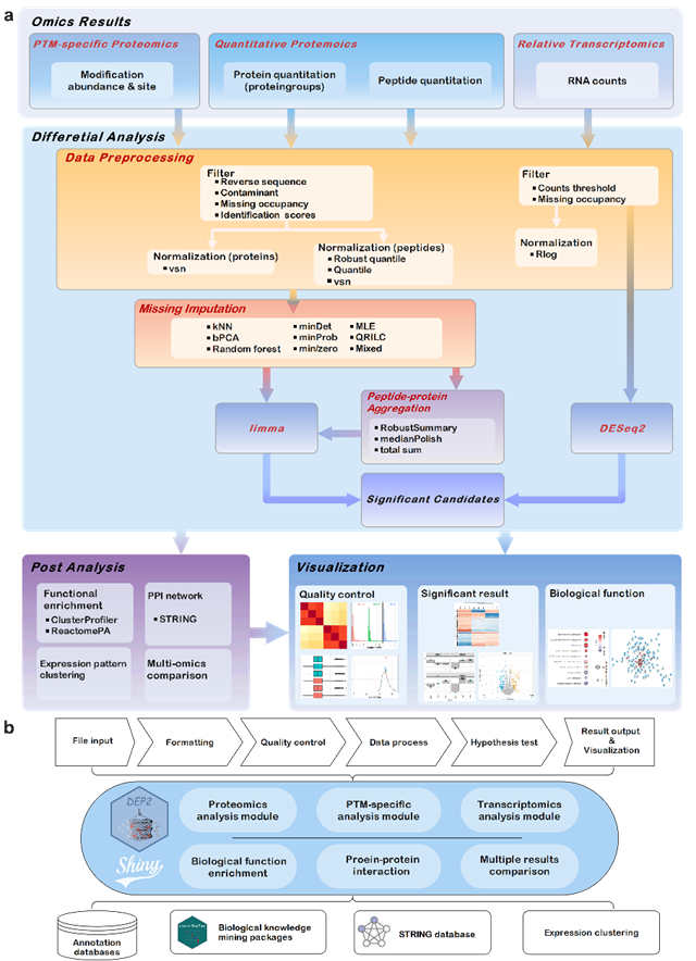 近日,中國科學院廣州生物醫(yī)藥與健康研究院張小飛團隊在Bioinformatics發(fā)表題為DEP2: an upgraded comprehensive analysis toolkit for quantitative proteomics data的論文。該成果揭示了一個可用于處理多種蛋白質組定量軟件輸入數(shù)據(jù)的R包DEP2。DEP2是一個用于定量蛋白質組學數(shù)據(jù)下游處理、差異分析、可視化的工具R包,利用S4對象進行數(shù)據(jù)打包并通過limma進行差異分析。DEP2集成肽段至蛋白重定量算法、缺失值填充方法,可用于分析肽段層面和蛋白組層面的定量蛋白質組、修飾蛋白質組數(shù)據(jù)。同時DEP2捆綁了一個用模塊化搭建的shiny應用,可以無代碼方式同時處理多個蛋白質組學數(shù)據(jù)。DEP2兼容多類型上游結果,為研究人員處理蛋白質組數(shù)據(jù)提供便利。該R包已開源發(fā)布在https://github.com/mildpiggy/DEP2。